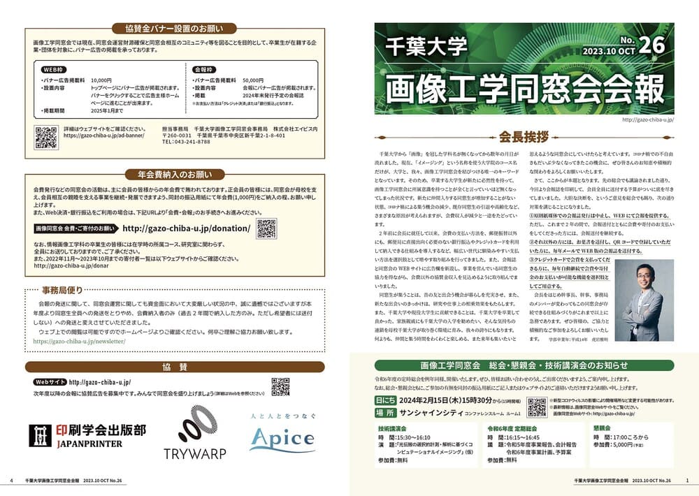 画像工学同窓会の会報を制作。表面は会長挨拶や定時総会のお知らせなど特に読んでいただきたい情報を分かりやすく配置しています。 裏面には各種お願い事項を掲載し、それぞれに対応するWebページのURLとQRコードを併載することで、同窓会公式サイトへのスムーズな導線を確保しました。