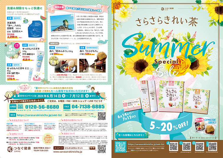 健康茶や化粧品などの販売をしている「株式会社つなぐ健康・日本本社」様の夏のキャンペーン情報をお知らせするDMを制作いたしました。女性をターゲットに、爽やかな水色を基調としたデザインで仕上げ、涼しげで魅力的な印象を与えるレイアウトを採用。商品やキャンペーンの魅力がしっかり伝わる構成にこだわりました。視覚的にも心地よく、ターゲット層の関心を引きつけるデザインで、訴求力のある販促ツールに仕上げています。